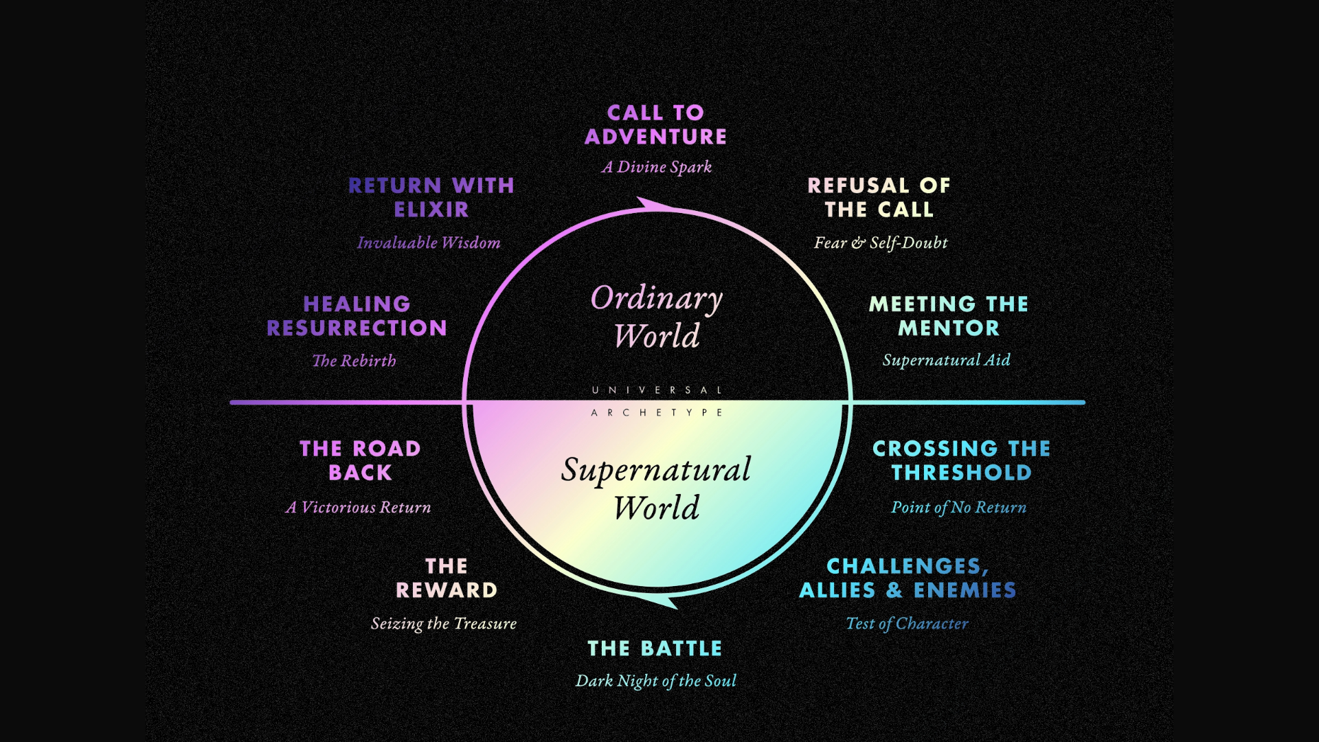 This is the Hero's Journey by Joseph Cambell. The steps in the Hero's Journey aren't literal, you'll find many different versions online. The key is that there's a process. It's an archetypal roadmap for the spiritual awakening and development of heroes in all the great stories. You've seen this played out in famous tales such as: